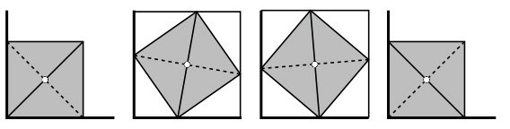 Forgassunk egy egész négyzetet át a sarkon az ábra szerint. Ha az eredeti egyenlő szárú derékszögű háromszög átfogón levő csúcsai $(0,a)$ és $(b,0)$ , akkor a négyzet további csúcsai $(a+b,b)$ és $(a,a+b)$ , így a négyzet középpontja $\left(\frac{a+b}{2},\frac{a+b}{2}\right)$ . A négyzet oldala, azaz a $\sqrt{a^2+b^2}=c$ mennyiség rögzített, értéke most $ 2$ m, míg $b$ értéke befutja a $[0;2]$ intervallumot. Miközben $b$ értéke $ 0$ -tól $ 1$ -ig nő, a négyzet középpontja a $P_0(1;1)$ ponttól a $P_1(\sqrt{2};\sqrt{2})$ pontig mozog $P_0$ -tól mindig $P_1$ felé a $P_0P_1$ szakaszon, tehát megtett útja méterben $\sqrt{2}(\sqrt{2}-1)$ . Amikor $b$ értéke $ 1$ és $ 2$ között változik, a négyzet középpontja visszamegy a $P_1P_0$ szakaszon $P_1$ -től $P_0$ -ba. A teljes megtett út méterben $ 2\sqrt{2}(\sqrt{2}-1)=4-2\sqrt{2}$ , ami centiméterben kb. 117.