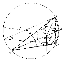 A kerületi szögek tétele alapján a $K$ középpontú és $r$ sugarú körben tetszőleges $\alpha $ kerületi szög szárainak a körrel való metszéspontjai megadják a háromszög $BC=a$ oldalát. Az $O$ pont -- a fentiek szerint -- rajta van azon a BC köríven, melynek pontjaiból a BC távolság $ 90^{\circ}+\frac{\alpha }{2}$ szög alatt látszik és amely körív a BC oldalnak ugyanazon oldalán van, mint az $\alpha $ szög csúcspontja. E látószög-kör középpontja $P$ -vel jelölve, a középponti és kerületi szög közötti összefüggés alapján