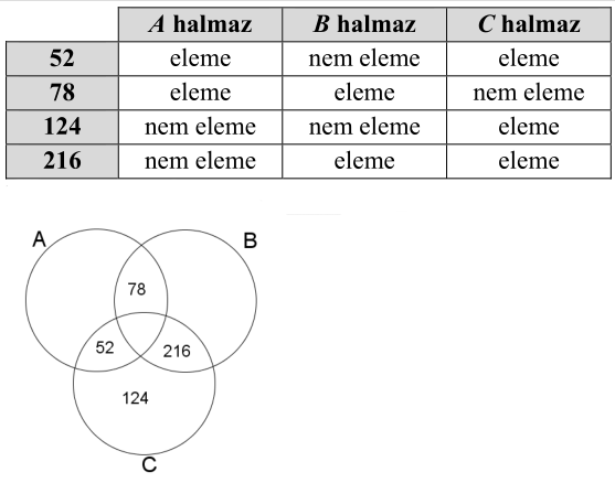 a) Töltse ki a táblázatot a minta alapján, majd a táblázat alapján írja be az 52, 78, 124, 216 számokat a halmazábra megfelelő tartományába!