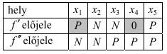 a) Az ábrán a harmadfokú $f$ függvény grafikonjának egy részlete látható. A függvény értelmezési tartományában megjelöltünk öt helyet. Mindegyik esetben döntse el, hogy az adott helyen az f első, illetve második deriváltjának előjele pozitív (P) vagy negatív (N)! Válaszát írja a megadott táblázat meg- felelő cellájába! (Tudjuk, hogy $f'( x_4 ) = 0$ .)