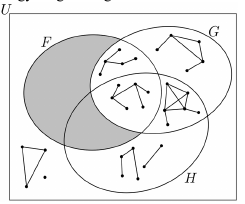 Legyen az $U$ alaphalmaz a legalább 4 pontú egyszerű gráfok halmaza. Az $F$ halmaz az $U$ elemei közül pontosan azokat tartalmazza, amelyek fagráfok, a $G$ halmaz pontosan azokat, amelyek összefüggő gráfok, a $H$ halmaz pedig pontosan azokat, amelyek 6 pontú gráfok.