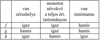 c) Töltse ki az alábbi táblázatot az „igaz” és „hamis” szavakkal annak megfelelően, hogy az adott kijelentés igaz vagy hamis az adott függvény esetén!