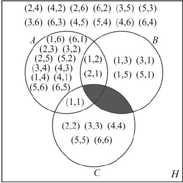Egy kék és egy zöld dobókockával dobunk, a dobás kimenetele egy számpár. Jelölje (k, z) a dobásnak azt a kimenetelét, amikor a kék kockával dobott szám k, a zöld kockával dobott szám pedig z. Legyen a H alaphalmaz a dobás kimeneteleként megkapható összes lehetséges (k, z) számpár halmaza. Az $ A $, $ B $ és $ C $ részhalmazokat a következőképpen definiáljuk:
