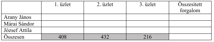 Egy könyvkiadó minden negyedévben összesíti, hogy három üzletében melyik szépirodalmi kiadványából fogyott a legtöbb. A legutóbbi összesítéskor mindhárom üzletben ugyanaz a három szerző volt a legnépszerűbb: Arany János, Márai Sándor és József Attila. Az alábbi kördiagramok szemléltetik, hogy az üzletekben milyen arányban adták el ezeknek a szerzőknek a műveit. A kördiagramok az első üzletből 408, a másodikból 432, a harmadikból 216 eladott könyv eloszlásait szemléltetik.