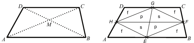 Ősszel a másik ábra alapján tervezték meg a virágok elhelyezését. (Az E, F, G és H pontok a trapéz oldalainak felezőpontjai.) Ekkor is fehér (f), piros (p) és sárga (s) virágokat ültettek a tervrajz alapján.