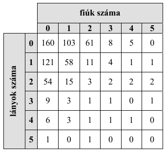 Egy felmérés során megkérdeztek 640 családot a családban élő gyermekek számáról, illetve azok neméről. A felmérés eredményét az alábbi táblázat mutatja: