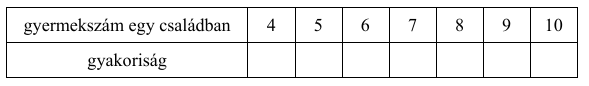 c) A családsegítő szolgálat a megkérdezett családok közül a legalább négy gyermeket nevelőket külön támogatja. Az alábbi táblázat kitöltésével készítsen gyakorisági táblázatot a külön támogatásban részesülő családokban lévő gyermekek számáról!