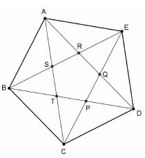 Megrajzoltuk az ABCDE szabályos ötszöget, és berajzoltuk minden átlóját. Az átlók metszéspontjait az ábra szerint betűztük meg: P, Q, R, S, T.