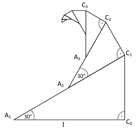 Az $ A_1C_0C_1 $ derékszögű háromszögben az $ A_1 $ csúcsnál $ 30^\circ $-os szög van, az $ A_1C_0 $ befogó hossza 1, az $ A_1C_1 $ átfogó felezőpontja $ A_2 $. Az $ A_2C_1 $ szakasz "fölé" az $ A_1C_0 C_1 $ háromszöghöz hasonló $ A_2 C_1C_2 $ derékszögű háromszöget rajzoljuk az ábra szerint.