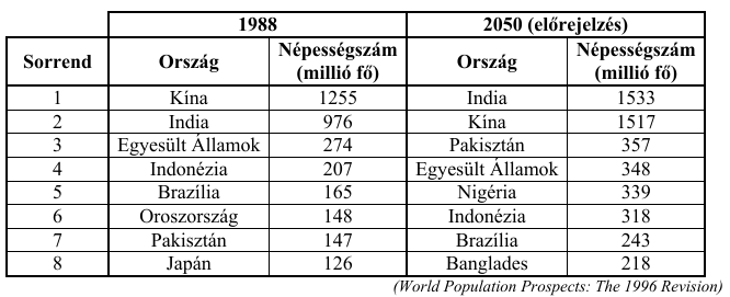 Az ENSZ 1996-ban megjelent táblázatának egy részlete a nyolc legnagyobb népességszámú ország népességi adatait tartalmazza 1988-ban, és egy népesedésdinamikai modell előrejelzése alapján 2050-ben.