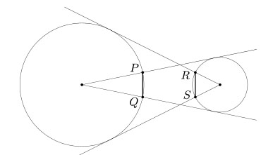 Két, nem metsző kör középpontjaiból érintőket húzunk a másik körhöz (lásd ábra). P , Q és R, S azok a pontok, ahol ezek az érintők metszik a köröket. Bizonyítsuk be, hogy PQ = RS.