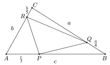 Adott az ABC háromszög. Legyen P az AB oldal harmadoló pontja, Q a BC oldal negyedelő pontja, valamint R a CA oldal ötödölő pontja az ábrán látható módon. Határozzuk meg a P QR és az ABC háromszögek területének arányát.