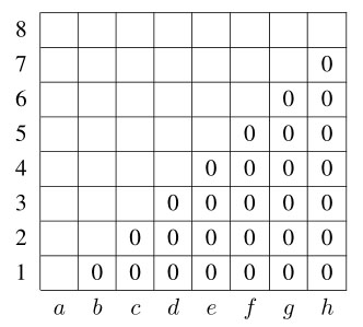 Adott egy 8 × 8-as táblázat. Nevezzük főátlónak az a1 – h8 átlót. A főátló alatti mezőket 0-kal töltjük ki, míg a többi mezőbe pozitív egészeket írunk. A kitöltés után kiszámoljuk a sor-, illetve oszlopösszegeket. Lehetséges-e, hogy az 1, 2, 3, . . . , 16 számokat kapjuk eredményül (valamilyen sorrendben)?