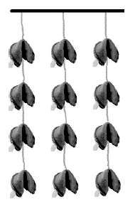 Zsuzsi különleges karácsonyi ajándékkal lepte meg Petit. Szerencsesütiket sütött és ezeket felfűzte három cérnaszálra, minden cérnaszálon egymás alá négyet, majd a cérnákat egy hurkapálcára kötötte, az ábrán látható módon. Minden szerencsesütiben más-más jókívánság található. Az a szabály, hogy Peti egy adott cérnaszálról mindig csak a legalsó sütit eheti meg. Ha Peti elfogyaszt egy szerencsesütit, a jókívánságot kiragasztja a falra, sorban egymás mellé. Peti úgy gondolja, hogy a jókívánságok legalább 35 000-féle sorrendben követhetik egymást, Zsuzsi viszont azt állítja, hogy a jókívánságok lehetséges sorrendjeinek száma kevesebb, mint 35 000. Kinek van igaza?