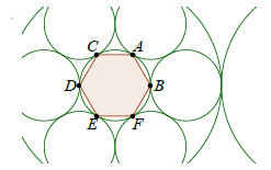 Az egységnyi oldalú szabályos hatszög köré kört írunk, majd ezt a kört kívülről érintő 6 egybevágó, egymást páronként érintő kört, mint ahogy az ábrán látható. Ezt követően e hat kört kívülről érintő nagyobb kört rajzolunk, majd ismét kifelé ezt érintő hat, egymást is páronként érintő kört rajzolunk. Az eljárást addig folytatjuk, míg nem keletkezik 2018-nál nagyobb sugarú kör. Hány kört rajzoltunk összesen?