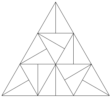 Egy szabályos háromszög minden oldalát n egyenlő részre osztjuk, majd az osztáspontokon át a megfelelő oldalakkal párhuzamosakat húzva felosztjuk a háromszögünket n2 darab kisebb szabályos háromszögre. Ezek után a kisebb háromszögek közül néhánynak megrajzoljuk az egyik súlyvonalát arra figyelve, hogy egyetlen súlyvonalnak se legyen semelyik másik súlyvonallal közös (vég)pontja. Például az alábbi ábrán n = 3 esetén mind a kilenc kisebb háromszög egy-egy súlyvonalát megrajzoltuk. Jelölje $ s(n) $ azt a legnagyobb számot, amennyi súlyvonal szabályosan berajzolható adott n esetén. (A lenti ábra alapján $ s(3) = 9 $ például.)
