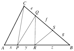 Az $ ABC $ háromszöget az ábra szerint feldaraboljuk öt egyenlő területű háromszögre. A keletkezett öt kis háromszög azon oldalainak hossza, amelyek az $ ABC $ háromszög oldalaira esnek, egész számok. Legalább mekkora az $ ABC $ háromszög kerülete?