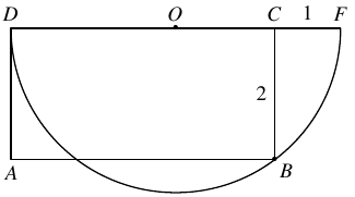 Jelölje O a DF szakasz felezőpontját és rajzoljunk félkört a DF szakasz fölé. Az ABCD téglalap (az ábra szerint) úgy helyezkedik el, hogy D és B csúcsai illeszkednek a félkörre, valamint a CF szakasz hossza 1, a CB szakasz hossza pedig 2 egység hosszúságú. Mekkora az ABCD téglalap területe?