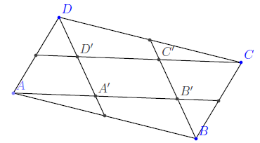 Egy adott $ABCD$ paralelogramma oldalait osszuk fel az óramutató járásával ellentétes irányban haladva ciklikusan $k:l$ arányban és az osztópontokat kössük össze az azonos körüljárás szerinti harmadik csúccsal. Mekkorának kell választanunk a $k:l$ arányt, hogy a keletkező $A'B'C'D'$ paralelogramma területe egytizenharmad része legyen a megadott $ABCD$ paralelogramma területének?