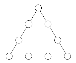 Az ábrán látható háromszög oldalai mentén az üres körökben elhelyeztük az egyjegyű pozitív számok négyzeteit, mindegyiket egyszer felhasználva úgy, hogy a háromszög bármely oldala mentén ugyanakkora lett a négy szám összege. Mennyi a csúcsokba írt számok összege?
