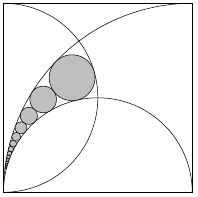 A sagres-i iskolában úgy tartották, hogy csak abból válhat biztos kezű térképrajzoló, aki nagy méretben is pontosan meg tudja szerkeszteni az itt látható ábrát. Ebben két félkört és egy negyedkört szerkesztettek egy négyzetbe, majd az egyik keletkező síkrészbe egyre kisebb szürke köröket szerkesztettek úgy, hogy sorra érintsék egymást és a térrészt határoló nagyobb köríveket is. Nektek nem muszáj megszerkesztenetek az ábrát. Elég, ha megmondjátok, hogy a szürke körök közül a tizedik legnagyobbnak a sugara hányad része a négyzet oldalának. A megoldás egy tört, a válasz a tört legegyszerűbb alakjában a számláló és a nevező összege!