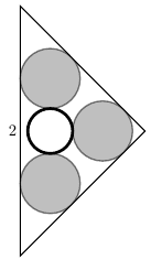 Három hordó bort és egy hordó vizet szeretnénk elhelyezni egy hajó tatjában kialakított tárolóhelyen. Mindegyik hordó 1 egység magas, egyenes henger alakú. A három boroshordó egyforma keresztmetszetu, a vizeshordó lehet náluk kisebb vagy nagyobb. Az alábbi felülnézeti rajzon látható módon szeretnénk oket elhelyezni: a három egybevágó szürke kör a boroshordókat, a fehér kör a vizeshordót jelöli. A rendelkezésre álló hely felülnézetbol egy 2 egység átfogójú, egyenlo szárú derékszögu háromszög. A boroshordóknak két-két falhoz, a vizeshordónak a három boroshordó közé kell szorulnia. Számítsuk ki, hogy ezen feltételek mellett hány köbegység a négy hordó össztérfogatának legkisebb lehetséges értéke.