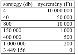 c) Számítsa ki, hogy ebben a szerencsejátékban az első sorsjegyet megvásárló személy nyereségének mennyi a várható értéke! (A nyereség várható értékének kiszámításához nemcsak a megnyerhető összeget, hanem a sorsjegy árát is figye- lembe kell venni.)