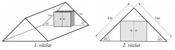 Kovács úr a tetőterébe egy téglatest alakú beépített szekrényt készíttet. Két vázlatot rajzolt a terveiről az asztalosnak, és ezeken feltüntette a tetőtér megfelelő adatait is. Az első vázlat "térhatású", a második pedig elölnézetben ábrázolja a szekrényt.