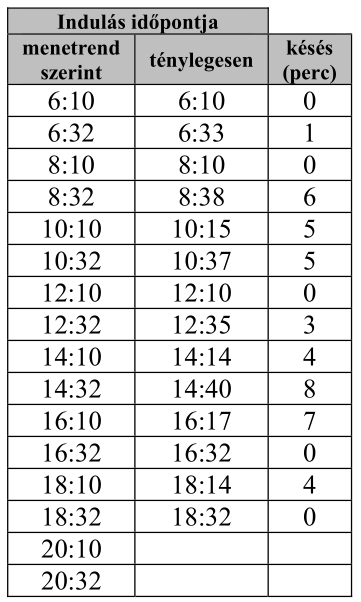 Egy kisváros vasútállomásáról munkanapokon 16 vonat indul, ezek indulási időpontjáról kimutatást vezetnek. A mellékelt táblázat ezt mutatja egy adott munkanap esetében. A vasútvállalat pontosságra vonatkozó előírása szerint munkanapokon a vonatok legalább egyharmadának pontosan kell indulnia az állomásról, továbbá a késéseknek sem az átlaga, sem a mediánja nem haladhatja meg a 3 percet.