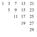 A pozitív páratlan számokat "háromszög" alakban rendezzük el a következők szerint: az első oszlopba írjuk az első páratlan számot, a második oszlopba a következő kettőt, a harmadik oszlopba a következő hármat, és így tovább. Például az ötödik oszlop negyedik helyén a 27 áll (lásd az ábrát is).