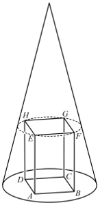 A négyzetes oszlop köré egy $P $ csúcspontú forgáskúpot illesztünk úgy, hogy az $ A $, $ B $, $ C $, $ D $ csúcsok a kúp alaplapjára, az $ E $, $ F $, $ G $, $ H $ csúcsok pedig a kúp palástjára illeszkedjenek. (A kúp és a négyzetes oszlop tengelye egybeesik.) A kúp magassága 45 egység.