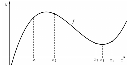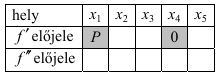 a) Az ábrán a harmadfokú $f$ függvény grafikonjának egy részlete látható. A függvény értelmezési tartományában megjelöltünk öt helyet. Mindegyik esetben döntse el, hogy az adott helyen az f első, illetve második deriváltjának előjele pozitív (P) vagy negatív (N)! Válaszát írja a megadott táblázat meg- felelő cellájába! (Tudjuk, hogy $f'( x_4 ) = 0$ .)