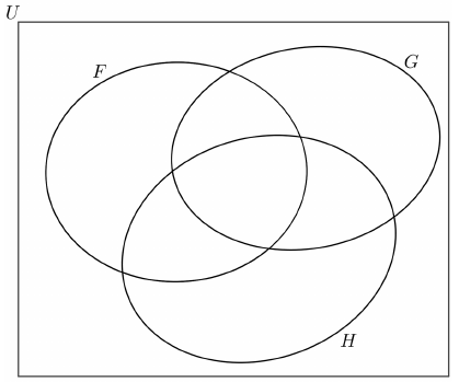 Legyen az $U$ alaphalmaz a legalább 4 pontú egyszerű gráfok halmaza. Az $F$ halmaz az $U$ elemei közül pontosan azokat tartalmazza, amelyek fagráfok, a $G$ halmaz pontosan azokat, amelyek összefüggő gráfok, a $H$ halmaz pedig pontosan azokat, amelyek 6 pontú gráfok. a) Az alábbi ábrán satírozással jelölje meg, és halmazműveletekkel is adja meg az $U$-nak azt a részhalmazát, amelyik üres halmaz! b) A megadott Venn-diagram minden egyes további részébe rajzoljon pontosan egy lehetséges gráfot!