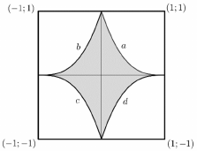 Ha a táblát egy olyan koordináta-rendszerbe helyezzük, amelyben a négyzet csúcsainak koordinátái $(1; 1)$, $(–1; 1)$, $(–1; –1)$, illetve $(1; –1)$, akkor ebben a koordináta-rendszerben az a jelű ív egyenlete: $y = (1 - x )^3$, $ 0 \le x \le 1$. A tábla középpontosan és tengelyesen is szimmetrikus. a) Írja fel a másik három (az ábrán b, c, illetve d jelű) ív egyenletét is! A társasjáték gyártója a 2 dm oldalú tábla fehér színű részének bevonásához egy speciális anyagot használ. Ebből 1 kg mennyiség 12 $m^2$ terület bevonásához elegendő. b) Számítsa ki, hogy 4000 darab tábla elkészítéséhez hány kg speciális anyag szükséges! A kétszemélyes társasjátékban minden játszma csak valamelyik játékos győzelmével végződhet, döntetlen nincs. Minden játszmában 1 pontot kap a győztes, a vesztes pedig 0 pontot. Anna és Bori nagyon szereti ezt a társasjátékot, sok játszmát lejátszottak már. Ha egymás ellen játszanak, akkor Anna 0,4 valószínűséggel, Bori pedig 0,6 valószínűséggel nyer meg egy játszmát. Egyik alkalommal megállapodnak, hogy addig játszanak újabb játszmákat, amíg valamelyikük először éri el a 10 pontot (és így megnyeri a játékot). c) Mennyi annak a valószínűsége, hogy Bori legfeljebb 12 játszma után megnyeri a játékot? (Kezdéskor mindkettőjüknek 0 pontja van.)