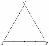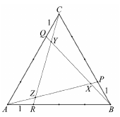 Az $ ABC $ szabályos háromszög mindhárom oldalát 3-3 osztóponttal négy egyenlő részre osztottuk. a) Hány olyan négyszög van, melynek mind a négy csúcsa a háromszög oldalain kijelölt 9 pont közül való úgy, hogy a négyszögnek a háromszög mindegyik oldalán van legalább egy csúcsa? (Két négyszöget különbözőnek tekintünk, ha legalább egy csúcsukban különböznek.) Jelölje a 4 egység oldalú $ ABC $ szabályos háromszög $ BC $ ol dalának $ B $-hez közelebbi negyedelőpontját $ P $, a $ CA $ oldal $ C $-hez közelebbi negyedelőpontját $ Q $, az $ AB $ oldal $ A $-hoz közelebbi negyedelőpontját pedig $ R $. Jelölje továbbá $ AP $ és $ BQ $ szakaszok metszéspontját $ X $, $ BQ $ és $ CR $ szakaszok metszéspontját $ Y $, végül $ CR $ és $ AP $ szakaszok metszéspontját $ Z $.