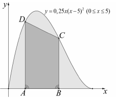 Adott az $ y = 0, 25 x( x - 5)^2;\ (0\le x \le 5) $ egyenletű görbe. a) Igazolja, hogy az origó és az $ (5; 0) $ pont is rajta van a görbén! Az $ ABCD $ derékszögű trapéz egyik szárának két végpontja az $ A(1; 0) $, illetve a $ B(3; 0) $ pont, a másik két csúcsa pedig a megadott görbén van, az ábra szerint. A megadott görbe és az x tengely $ [0; 5] $ szakasza egy korlátos síkidomot fog közre. b) Ha véletlenszerűen kiválasztjuk ennek a korlátos síkidomnak egy pontját, akkor mennyi a valószínűsége, hogy a kiválasztott pont a trapéznak is pontja lesz?