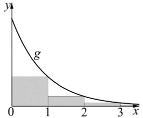 A koordinátatengelyek és a $ g( x ) = 3^{- x} $ ($ x \ge 0 $) függvény grafikonja által határolt tartományba olyan egymáshoz csatlakozó téglalapokat írunk, amelyek egyik oldala az x-tengelyen van és egységnyi hosszúságú, egyik csúcsa pedig a $ g $ függvény grafikonjára illeszkedik.