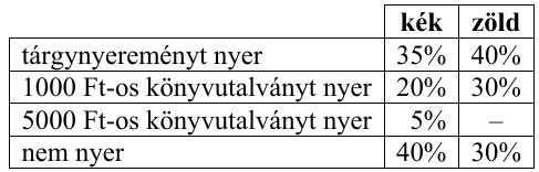 A sorsjegyek $ 40\% $-a kék, $ 60\% $-a zöld. A különböző színű sorsjegyekhez tartozó nyeremények arányát mutatja a táblázat (például az összes kék sorsjegynek a $ 35\% $-a tárgynyereményt nyer).