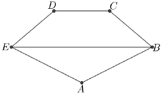Az ABCDE konvex ötszögben AB=AE=20 cm és BC=CD=DE. A BCDE négyszög egy húrtrapéz, amelynek a B-nél fekvő belső szöge $ 40^\circ $-os. Az A csúcs és az EB átló távolsága 10 cm. a) Mekkorák az ötszög (belső) szögei? b) Mekkora az ötszög területe? c)Hányféleképpen járható be az ábrán látható ABCDE ötpontú gráf, ha mindegyik élén pontosan egyszer kell végighaladnunk? (A bejárás kezdőpontja a gráf egyik csúcsa; egy csúcsba érkezve csak olyan élen haladhatunk tovább, amely szintén az adott csúcsból indul.)