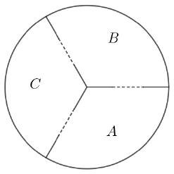 Egy számítógépes játékban egy kör alakú tartomány az ábra szerint három résztartományra van felosztva (A, B, C). Bármely két tartomány között egy átjáró van (az ábrán szaggatott vonallal jelölve). A tartományok közötti átjárók mindegyike a többitől függetlenül p valószínűséggel van nyitva (0 < p < 1). Egyik tartományból a másikba csak nyitott átjárón (vagy átjárókon) keresztül lehet eljutni.