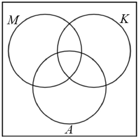 b) Jelölje az ábrán satírozással a $ (K \cap A) \setminus M $ halmazt, és hozzárendelési szabályával adjon meg egy olyan $ j $ függvényt, amely ebbe a halmazba tartozik!