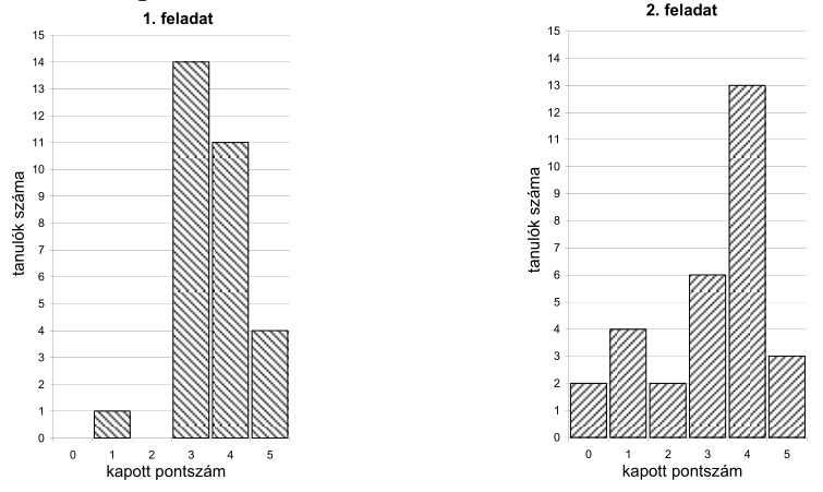 Egy iskolai tanulmányi verseny döntőjébe 30 diák jutott be, két feladatot kellett megoldaniuk. A verseny után a szervezők az alábbi oszlopdiagramokon ábrázolták az egyes feladatokban szerzett pontszámok eloszlását: