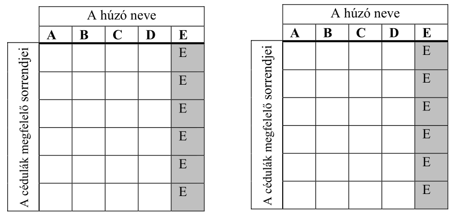 András, Balázs, Cili, Dóra és Enikő elhatározták, hogy sorsolással döntenek arról, hogy közülük ki kinek készít ajándékot. Úgy tervezték, hogy a neveket ráírják egy-egy papírcetlire, majd a lefelé fordított öt cédulát összekeverik, végül egy sorban egymás mellé leteszik azokat az asztalra. Ezután, keresztnevük szerinti névsorban haladva egymás után vesznek el egy-egy cédulát úgy, hogy a soron következő mindig a bal szélső cédulát veszi el.