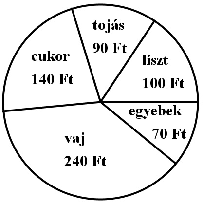Az ábra egy sütemény alapanyagköltségeinek megoszlását mutatja. Számítsa ki a „vaj” feliratú körcikk középponti szögének nagyságát fokban! Válaszát indokolja!