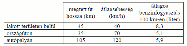 Egy család személyautóval Budapestről Keszthelyre utazott. Útközben lakott területen belül, országúton és autópályán is haladtak. Az utazással és az autóval kapcsolatos adatokat a következő táblázat tartalmazza: