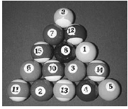 A biliárdjáték megkezdésekor az asztalon 15 darab azonos méretű, különböző színezésű biliárdgolyót helyezünk el háromszög alakban úgy, hogy az első sorban 5 golyó legyen, a másodikban 4, a következőkben pedig 3, 2, illetve 1 golyó. (A golyók elhelyezésére vonatkozó egyéb szabályoktól tekintsünk el.)