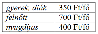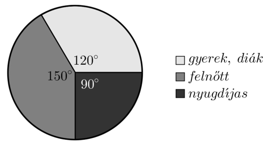 Az alábbi kördiagram egy balatoni strandon a júliusban megvásárolt belépőjegyek típusának eloszlását mutatja. Júliusban összesen 16 416 fő vásárolt belépőjegyet. A belépőjegyek árát az alábbi táblázat tartalmazza.