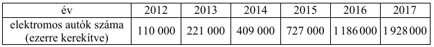 Péter az előző táblázat adatai alapján olyan matematikai modellt alkotott, amely az elekt- romos autók számát exponenciálisan növekedőnek tekinti. E szerint, ha a 2012 óta eltelt évek száma $ x $, akkor az elektromos autók számát (millió darabra) megközelítőleg az $ f ( x) = 0,122 \cdot 2^{0,822 x} $ összefüggés adja meg.