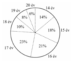 Egy több száz fős gimnázium diákjai életkorának eloszlását mutatja az alábbi kördiagram. Állapítsa meg a diákok életkorának terjedelmét, móduszát és mediánját!