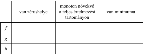 a) Oldja meg az alábbi egyenletet a valós számok halmazán! $ \dfrac{x^2-4x+4}{x^2-4}=2 $ Legyenek $ f $, $ g $ és $ h $ függvények a valós számok halmazán értelmezve úgy, hogy $ f(x)=x-1,\qquad g(x)=2^x,\qquad h(x)=|x|-3$ b) Adja meg annak a függvénynek a betűjelét, amely a (-2)-höz (-1)-et rendel! c) Töltse ki az alábbi táblázatot az „igaz” és „hamis” szavakkal annak megfelelően, hogy az adott kijelentés igaz vagy hamis az adott függvény esetén!